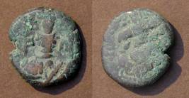 | Description / विवरण | Descrpn./Obv Stylised seated Goddess facing; Sharada legend, Ka (on l.) lasa ra (on r.). Descrpn./Rev Stylised standing king design; Sharada legend, jadeva (on r.) |
