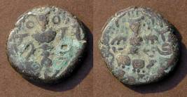 | Description / विवरण | Descrpn./Obv Stylised seated Goddess facing; Sharada legend, Ha (on l.) rsha ra (on r.). Descrpn./Rev Stylised standing king design; Sharada legend, jadeva (on r.) |