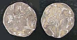 | Description / विवरण | Descrpn./Obv Recumbent bull facing left, wearing jhula (saddle cloth), with trisula (trident) symbol on rump. Above, legend in Sarada script Sri Samantadeva . Descrpn./Rev Rider with lance on caparisoned horse facing right. On left, Sarada letter bhi and on right, Sarada letter ta |