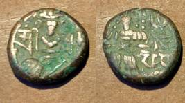 | Description / विवरण | Descrpn./Obv Stylised seated Goddess facing; Sharada legend, Sri (on l.) Sussala (on r.). Descrpn./Rev Stylised standing king design; Sharada legend, deva (on r.) |