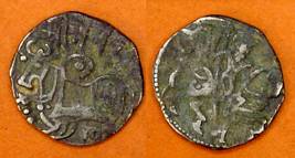 | Description / विवरण | Descrpn./Obv Recumbent bull facing left, wearing jhula (saddle cloth), with trisula (trident) symbol on rump. Above, legend in Sarada script Sri Samantadeva . Descrpn./Rev Rider with lance on caparisoned horse facing right. On left, Sarada letter bhi and on right, Sarada letter ta |