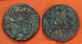 | Description / विवरण | Descrpn./Obv Recumbent bull facing left, wearing jhula (saddle cloth), with trisula (trident) symbol on rump. Above, legend in Sarada script Sri Samantadeva . Descrpn./Rev Rider with lance on caparisoned horse facing right. On left, Sarada letter bhi and on right, Sarada letter ta |