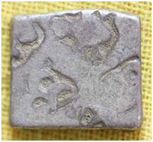 | Description / विवरण | The coin is an imperial type of Punch-marked coin. The coin is irregular in shape. Obverse Sun, three arched hill, six armed wheel, caduceus and fish. Reverse An animal figure and some indistinct symbols. |
