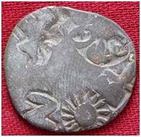 | Description / विवरण | The coin is an imperial type of Punch- marked coin. The shape of the coin is circular. Obverse six armed wheel, Jayadhwaja, Sun, human figure flanked by two taurines. Reverse Indistinct symbol. |