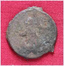 | Description / विवरण | The coin is circular in shape. Obverse- Probably the figure of Mao or Moon God with Right arm curved up wards and the crescent above the left shoulder. Reverse-Three hills or cone like objects placed in a straight line and below them some letters are inscribed. |