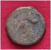 | Description / विवरण | The coin is circular in shape. Obverse- probably the figure of Mao or Moon God with Right arm curved Up wards and the crescent above the left shoulder. Reverse- Three hills or cone like objects placed in a straight line and below them some letters are inscribed |