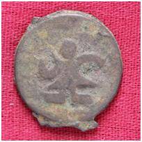 | Description / विवरण | The coin is circular in shape. Obverse- Kushana type king standing with his Right arm curved Up wards and the Left arm extended. Reverse- probably the figure of Mao or Moon God with Right arm curved Up wards and the crescent above the left shoulder. |