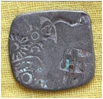 | Description / विवरण | It is an imperial type of Punch-marked Coin. The coin is irregular in shape. Obverse Contains five symbols i.e. Sun, six armed, four fishes in a tank, Human figureand river. Reverse Contains four symbols i.e. flower and others are indistinct. |