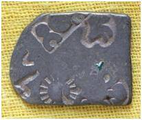 | Description / विवरण | It is an imperial type of Punch-marked Coin. The coin is rectangular in shape. Obverse Contains 5 symbols i.e. Sun, six armed, animal figure, a circle with dot flanked by two taurines, other are indistinct. Reverse Contains 3 symbols i.e. tree, others are indistinct. |