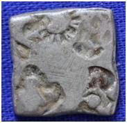 | Description / विवरण | The coin is an imperial type Punch- marked coin. The shape of the coin is rectangular. Obverse Sun, six armed chakra, bird and other symbols are indistinct. Reverse Chakra. |