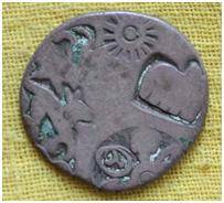 | Description / विवरण | The coin is an imperial type Punch- marked coin. The shape of the coin is round. Obverse Sun, six armed, bull, animal and other symbols are indistinct. Reverse Symbols are indistinct. |
