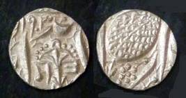 | Description / विवरण | Descrpn./Obv In the centre, a chhatra with Sa and Ta in Gurumukhi script on the left and right of its shaft; traces of the Persian legend seen on the obverse of the bigger Nanakshahi coins of Amritsar mint are also seen. Descrpn./Rev Big peepal leaf and traces of the Persian legend seen on the reverse of the bigger Nanakshahi coins of Amiritsar mint - Shri Amritsarjiv zarb [VS Year] Takht maimanat julus manus Akal Bakht. Especially traces of alif of Akal and te of Takht and maimanat are seen |
