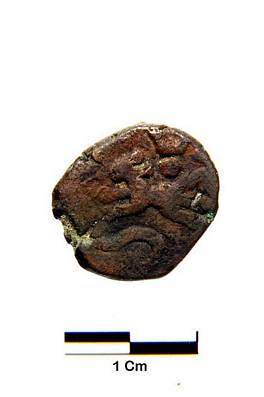 | Description / विवरण | Obverse- Triratna symbol depicted on above of some wavy lines. In center there is a depiction of an animal in running posture. Reverse- Indistinctive symbols . |