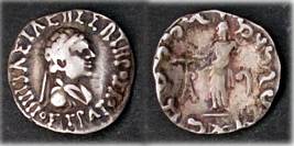 | Description / विवरण | Descrpn./Obv Diademed bust of king right; Greek legend, Basileos Suteros / Ippostratou. Descrpn./Rev City goddess standing left holding cornucopia; Kharoshthi legend, Maharajasa tratarasa / Hipustratasa |