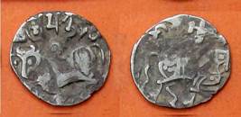 | Description / विवरण | Descrpn./Obv Recumbent bull facing left, wearing jhula (saddle cloth), with trisula (trident) symbol on rump. Above, legend in Sarada script Sri Samantadeva . Descrpn./Rev Rider with lance on caparisoned horse facing right. On left, Sarada letter bhi and on right, Sarada letter ta |