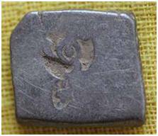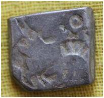 | Description / विवरण | The shape of the coin is irregular. Obverse Sun, Six armed wheel and another symbols are defaced. Reverse Three taurines around a circle with a conspicuous dot. |