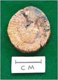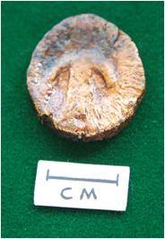 Obverse - A standing human figure whose body hands are visible only. Reverse - Not clearly visible.