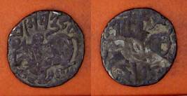 | Description / विवरण | Descrpn./Obv Recumbent bull facing left, wearing jhula (saddle cloth), with trisula (trident) symbol on rump. Above, legend in Sarada script Sri Samantadeva . Descrpn./Rev Rider with lance on caparisoned horse facing right. On left, Sarada letter bhi and on right, Sarada letter ta |