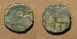 | Description / विवरण | Descrpn./Obv Recumbent bull facing left, wearing jhula (saddle cloth). Above, legend in Sarada script Sri Samantadeva (in cursive letters, mostly truncated and seen partially or off the flan). Descrpn./Rev Rider with lance on caparisoned horse facing right. |