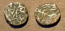 | Description / विवरण | Descrpn./Obv Recumbent bull facing left, wearing jhula (saddle cloth). Above, legend in Sarada script Sri Samantadeva (in cursive letters, mostly truncated and seen partially or off the flan). Descrpn./Rev Rider with lance on caparisoned horse facing right. |