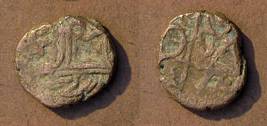| Description / विवरण | Descrpn./Obv Recumbent bull facing left, wearing jhula (saddle cloth). Above, legend in Sarada script Sri Samantadeva (in cursive letters, mostly truncated and seen partially or off the flan). Descrpn./Rev Rider with lance on caparisoned horse facing right. |