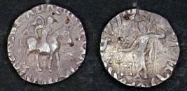 | Description / विवरण | Descrpn./Obv Diademed king on horseback to r., wearing armour and holding spear; Greek legend, Basileos Basileon Megalou / Onunou. Descrpn./Rev Zeus radiate, standing facing, holding long scepter in left hand and thunderbolt in outstretched hand; Kharoshthi legend, Spalahoraputrasa dhramikasa / Spalagadamasa |