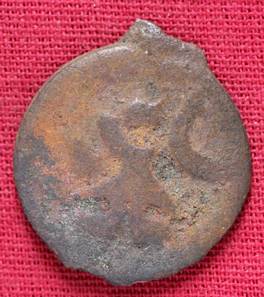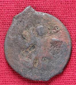 | Description / विवरण | The shape of the Coin is circular. Obverse -A Kushana type king standing with his right arm curved upwards and left arm curved downwards. Reverse -Probably, a standing figure of MAO or Moon-God with right arm curved upwards and the crescent above the left shoulder. The left arm is not visible |