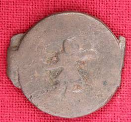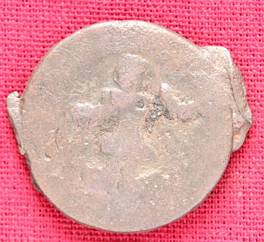 | Description / विवरण | The shape of the Coin is circular. Obverse -A Kushana type king standing with his right arm curved upwards and left arm curved downwards. Reverse -Probably, a standing figure of MAO or Moon-God with right arm extended and the crescent above the left shoulder. The left arm is not visible. |
