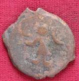 | Description / विवरण | The shape of the Coin is circular. Obverse -A Kushana type king standing with his right arm curved upwards and left arm curved downwards. Reverse -Probably, a standing figure of MAO or Moon-God with right arm curved upwards and the crescent above the left shoulder. The left arm is not visible |