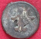 | Description / विवरण | The shape of the Coin is circular. Obverse -Probably, a standing figure of MAO or Moon-God with right arm curved upwards and the crescent above the left shoulder. The left arm is not visible. Reverse -Three hills or cone like objects placed in a straight Line and below then some legends inscribed. |