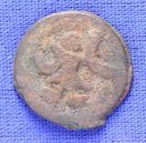 | Description / विवरण | The shape of the coin is circular. Obverse Kushana type king, standing with his right hand curved upwards and his left arm extended. Reverse Probably the figure MAO or Moon-God with his right arm curved upwards and the crescent above the left shoulder. |