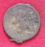 | Description / विवरण | The shape of the coin is circular. Obverse Probably the figure of MAO or Moon God with right arm curved upwards and the crescent above the left shoulder. Reverse Three hills or cone like objects placed in a straight line and below them some letters are inscribed. |
