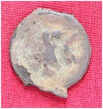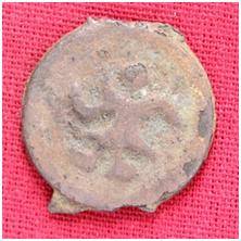 | Description / विवरण | The Shape of the Coin is Circular. Obverse A Standing figure of Kushana type king, with upwards curved right hand and downwards curved left hand, wears boots and tunic. Reverse Probably a standing figure of MAO or Moon-God with uplifted right hand and left hand is not visible, the crescent above the left shoulder. |