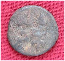 | Description / विवरण | The Shape of the Coin is Circular. Obverse Probably a standing figure of MAO or Moon-God with extended right hand and left hand is not visible, the crescent above the left shoulder. Reverse Legend below the three hills or three conical objects. |