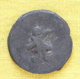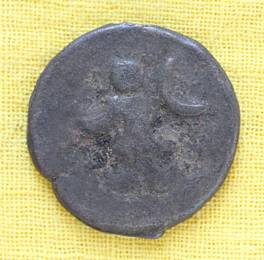 | Description / विवरण | The shape of the Coin is circular. Obverse -A Kushana type king standing with his right arm curved upwards and left arm curved downwards. Reverse -Probably, a standing figure of MAO or Moon-God with right arm curved upwards and the crescent above the left shoulder. The left arm is not visible. |