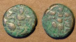 | Description / विवरण | Descrpn./Obv Stylised seated Goddess facing; Sharada legend, Ha (on l.) rsha ra (on r.). Descrpn./Rev Stylised standing king design; Sharada legend, jadeva (on r.) |