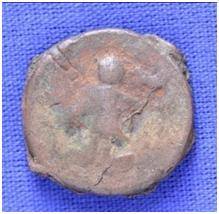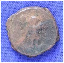 | Description / विवरण | The shape of the coin is circular. Obverse-Kushana type king standing with his right hand upwards and left arm extended. A small dot is found to the right top of the figure. Reverse-- probably the figure of MAO or Moon God- with right arm curved up wards and the crescent above the left shoulder. |
