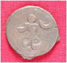 | Description / विवरण | The shape of the coin is circular. Obverse- Kushana type king standing with his right hand upwards and left arm extended. Reverse-- probably the figure of MAO or Moon God- with right arm curved up wards and the crescent above the left shoulder. |