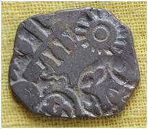 | Description / विवरण | The coin is an imperial type of Punch- marked Coin. The shape of the coin is irregular. Obverse Sun, Three arched hill, Taurine, Six vertical lines. Reverse A crescent topped one arched hill. |