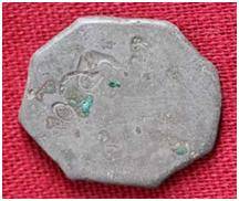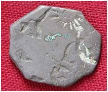 | Description / विवरण | The coin is an imperial type of Punch- marked Coin. The shape of the coin is irregular. Obverse Sun, Six armed wheel, animal, one taurine. Reverse The symbols are defaced. |