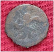 | Description / विवरण | The shape of the coin is circular. Obverse-Kushana type king, standing with his right hand curved up wards and left hand curved down wards. Reverse- Probably the figure of MAO or Moon-God with his right arm curved upwards and the crescent above the left shoulder. |