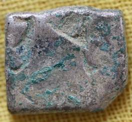 | Description / विवरण | The coin is irregular in shape. Obverse Symbol of sun. Other symbols are indistinct. Reverse Blank. Silver sulphate formation. |