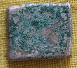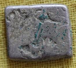 | Description / विवरण | The coin is irregular in shape. Obverse The coin contains the symbols of a three arched mountain, sun and an animal. Reverse The symbols are indistinct due to silver sulphate formation. |