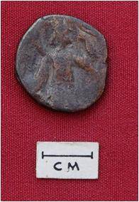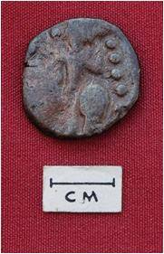| Description / विवरण | Obv. - Standing king figure right profile . Rev. - Probably siva standing in front a bull - 4 dots making a line. |