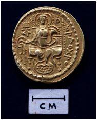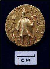 | Description / विवरण | Obverse - A king is standing holding a standar4d with left hand, pouring inscense over an altar with right hand. There is trident above the hand. There is legend in Kharosthi on the margin. Reverse - Seated goddess Ardores - Greek legend on side. |