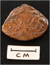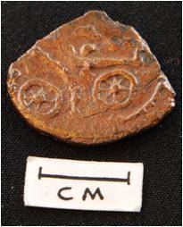 | Description / विवरण | An unshaped coin . Obverse - An elephant raising trunk above another animal figure but it is cut. Reverse - Two whell, curved dots undulating line, rest are not visible. |