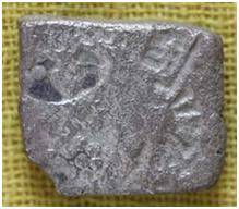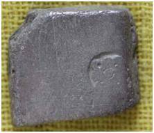 | Description / विवरण | The shape of the coin is irregular. Obverse Sun, Six armed wheel, tree, seven dots are around a dot, tree. Reverse Four taurines around a dot. |