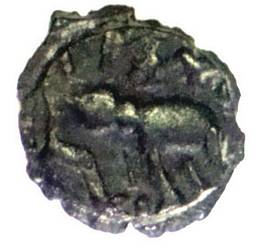 | Description / विवरण | Round shaped copper coin of the King Samagopa with legend the obverse and Ujjain symbol on the reverse. Obverse A walking elephant facing left, trunk hanging down with a curved tusk, tail hanging partly visible. A Srivatsa symbol is visible in between the legends above the animal. Reverse An Ujjain symbol having double circles in each object is partly visible. |