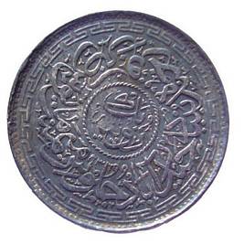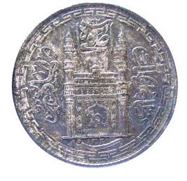 | Description / विवरण | Lot No. 11 1992 Circular silver coin with legends on both sides. Obverse Symbol of Charminar, Nizamul Malik, sifjah, Bahadur, 1328 with in a dotted border. Reverse Rupiya Ek, Hyderabad with in a circle. Juloos Maymanat Mayoos Zaraba Fi Jundihi Bunyadin with in a dotted border. |