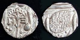 | Description / विवरण | Descrpn./Obv In the centre, a chhatra with Sa and Ta in Gurumukhi script on the left and right of its shaft; traces of the Persian legend seen on the obverse of the bigger Nanakshahi coins of Amritsar mint are also seen. Descrpn./Rev Big peepal leaf and traces of the Persian legend seen on the reverse of the bigger Nanakshahi coins of Amiritsar mint - Shri Amritsarjiv zarb [VS Year] Takht maimanat julus manus Akal Bakht. Especially traces of alif of Akal and te of Takht and maimanat are seen |